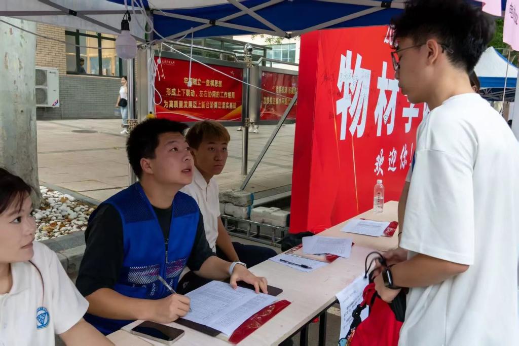 迎新现场,蓝色与粉色相间的帐篷错落有致,“物理与材料工程学院”的标识格外醒目。学院领导早早来到现场,仔细查看迎新工作的各项安排,从新生报到流程到物资准备,事无巨细地询问、叮嘱,只为给新同学带来最顺畅、暖心的入学体验。