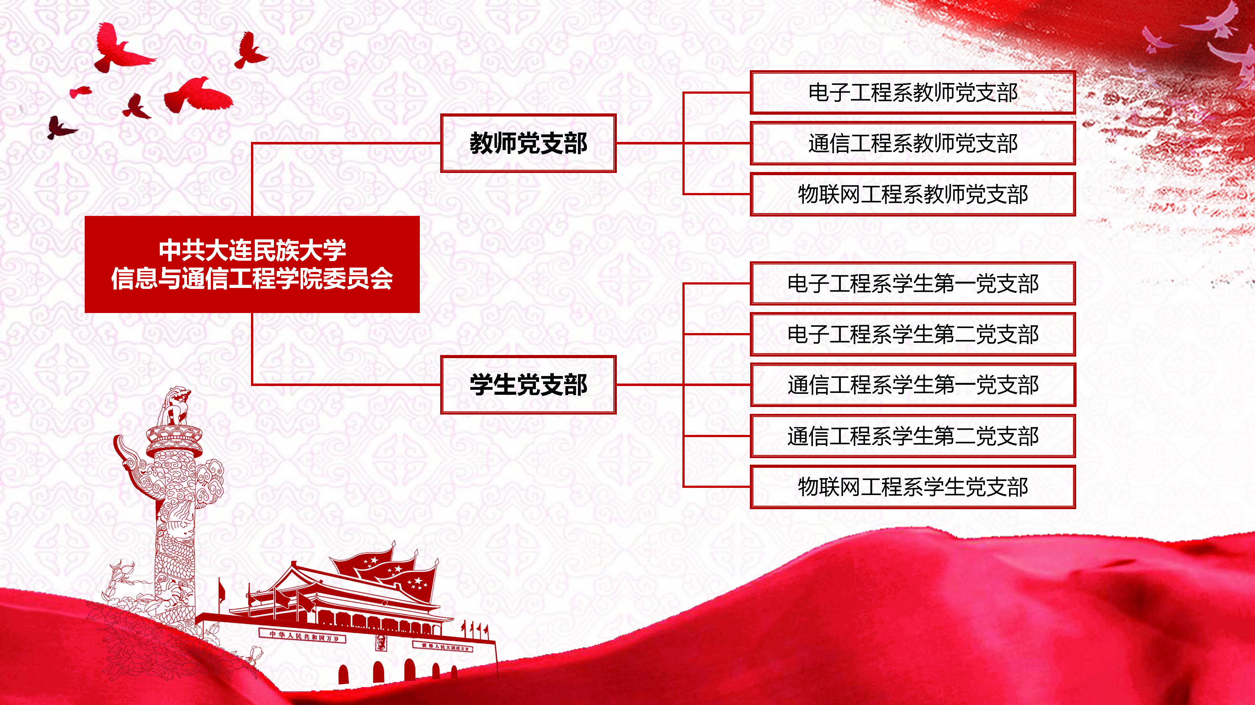 中共大连民族大学信息与通信工程学院委员会现有党员296人,其中教师(教工)党员45人,研究生党员108人,本科生党员143人。党委会成员9人,其中书记1人,副书记2人,委员6人。下设8个党支部,分别为电子工程系教师党支部、通信工程系教师党支部、物联网工程系教师党支部、电子工程系学生第一党支部、电子工程系学生第二党支部、通信工程系学生第一党支部、通信工程系学生第二党支部、物联网工程系学生党支部。